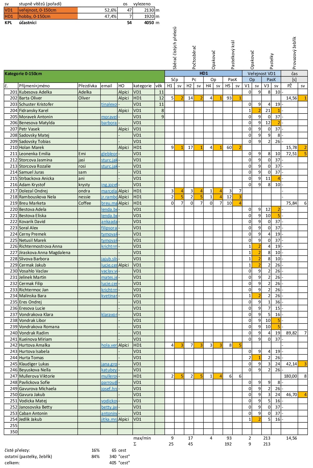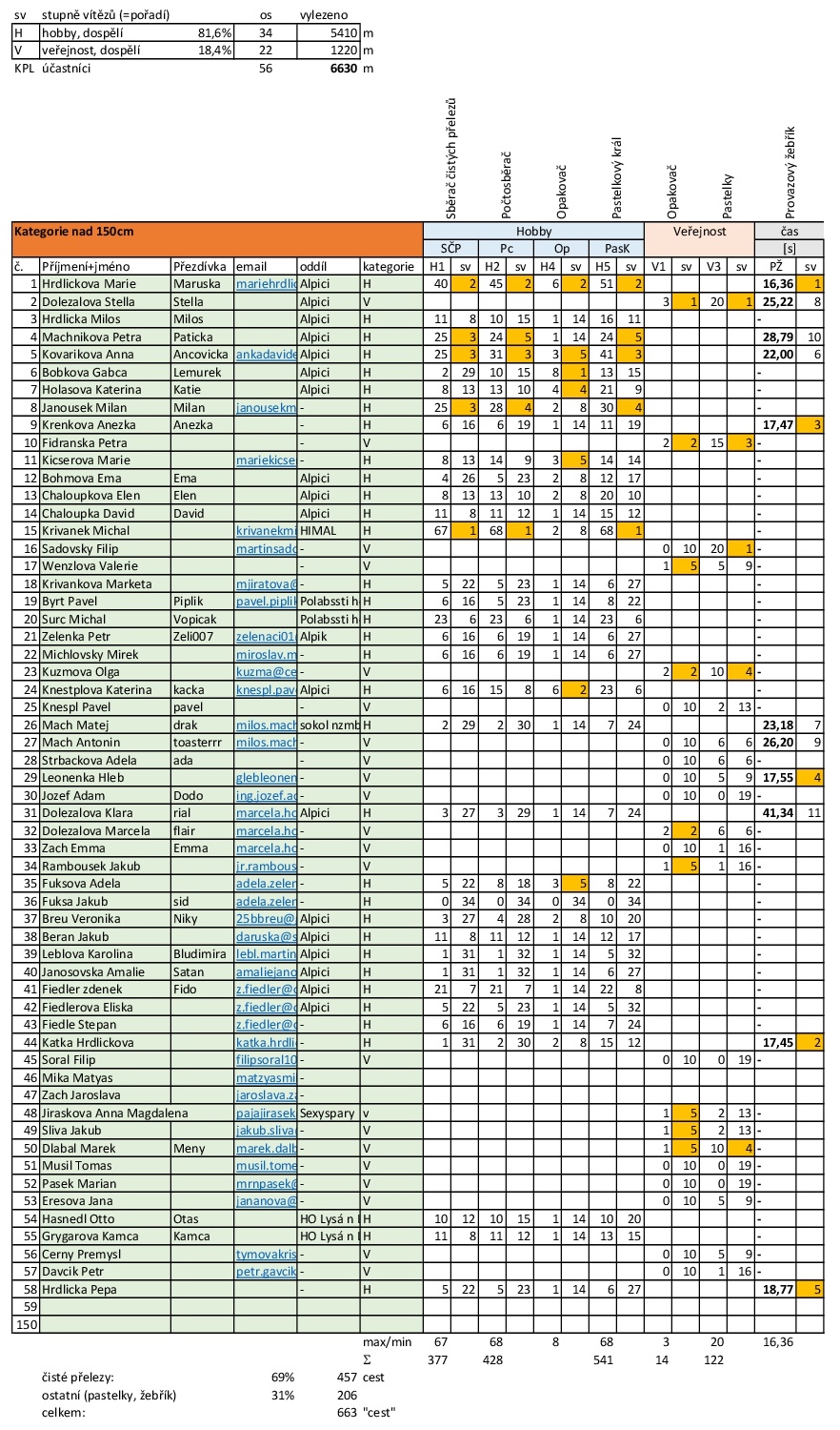 0-150cm=54 účastníků, v kategorii nad 150cm=56 účastníků. Celkem bylo nalezeno v čistých cestách 5220m (48,9%). Podrobné výsledky jednotlivých kategorií jsou zřejmé z tabulky níže.
